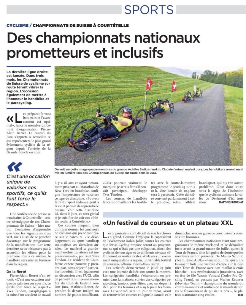 La dernière ligne droite est lancée. Dans trois mois, les Championnats de Suisse de cyclisme sur route feront vibrer la région. L’occasion également de mettre à l’honneur le handbike et le paracycling.